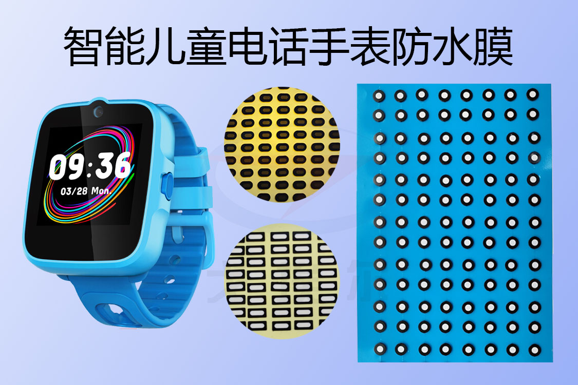 智能兒童電話手表防水膜通過高性能背膠粘附在智能手表密封殼體的相應的透聲孔或者透氣孔處,通過智能兒童電話手表防水膜可以保護敏感揚聲器、麥克風和受話器不受水、灰塵、污垢和其它雜質影響,同時