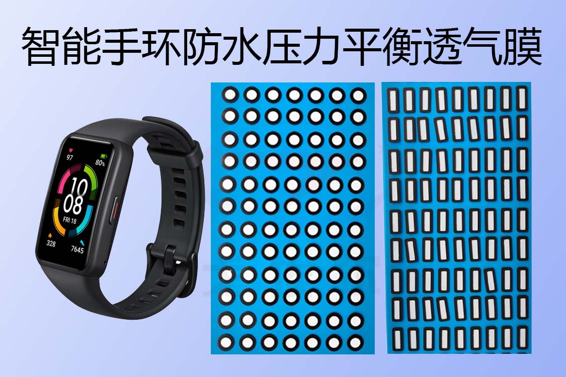 智能手環要實現在各種環境下的正常使用,智能手環的防水處理措施一般是從好幾個方面入手的,采用熱熔膠點膠或者硅膠點膠加工,來實現各個結構性部件(屏幕與殼體、底部鏡片與殼體、按鍵等)的防水密封,這就實現了整體性密封;但是因為智能手環有透氣需求,因此還要通過智能手環防水膜材料來實現透氣孔的防水透氣。戈埃爾智能手環壓力平衡透氣膜透氣量是很高的,智能手環壓力平衡透氣膜顏色也有黑膜和白膜兩種。智能手環壓力平衡透氣膜可以很好的實現防水與透氣目的,進而保證手環使用可靠性。