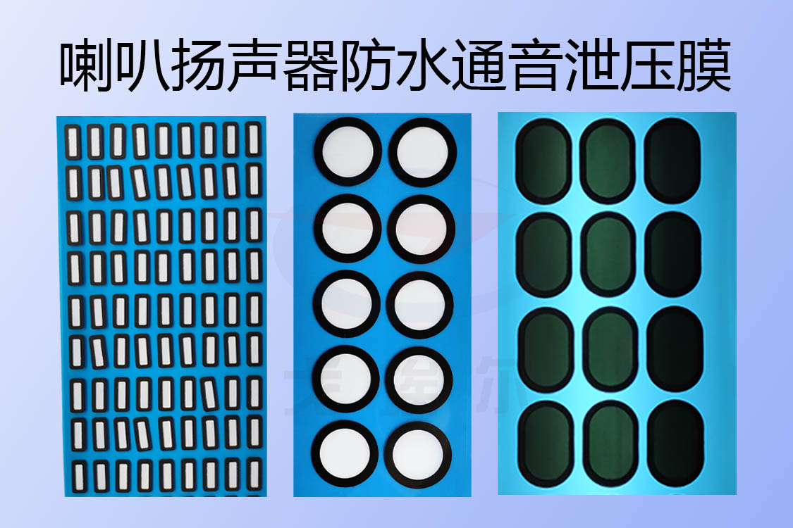 可以實現透氣泄壓的喇叭揚聲器防水通音膜一般是由eptfe微孔薄膜經模切加工制作而成的,是由ePTFE材料輔以防水背膠和PET材料經多道工藝制成的喇叭揚聲器防水透聲膜膜片,大多數用于各種電子產品比如說智能手機、三防手機、對講機、藍牙耳機、藍牙音箱、平板電腦等等產品的喇叭、揚聲器等發聲部件上,喇叭揚聲器防水通音泄壓膜安裝在透聲孔處就可以起到一個應具備的防水通音的作用,此外更是可以實現一定的透氣與泄壓能力,這些功能的實現,都是憑借喇叭揚聲器防水通音泄壓膜所采用的ePTFE材料性質來實現的,ePTFE材料具有很好的防水透氣透聲性能,因而可以實現安裝喇叭揚聲器防水通音膜的產品的透氣泄壓要求。