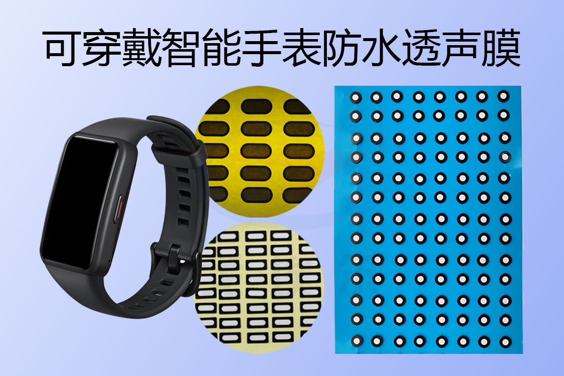可穿戴智能手表除了結構上進行防塵防水處理外,還會在喇叭、MIC這兩個電聲器件孔位融入智能手表防水透聲膜進行防護,通過喇叭防水膜將喇叭的防塵防水做好,讓喇叭發出的聲音可以透過喇叭防水膜到人耳,咪頭防水透聲膜則是做好MIC的防塵防水,讓外界的人聲通過咪頭防水透聲膜被MIC接收,喇叭防水膜與咪頭防水透聲膜都是必須要確保有著很好的防塵防水透聲性能,這樣安裝在殼體上的智能手表防水膜可以進一步提升可穿戴智能手表的可靠性、延長產品的使用壽命。